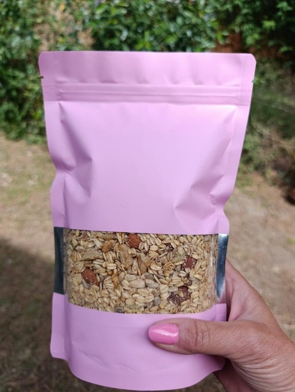 Avena, nuez, almendras, maní, semillas de girasol, de zapallo y lino, todo tostado con miel, coco rallado, pasas de uva sultaninas y rubias, copos naturales y hebras de salvado
