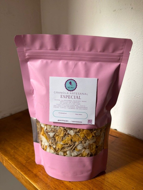 Avena, nuez, almendras, maní, semillas de girasol, de zapallo y lino, todo tostado con miel, coco rallado y en escamas, arándanos, copos naturales y hebras de salvado